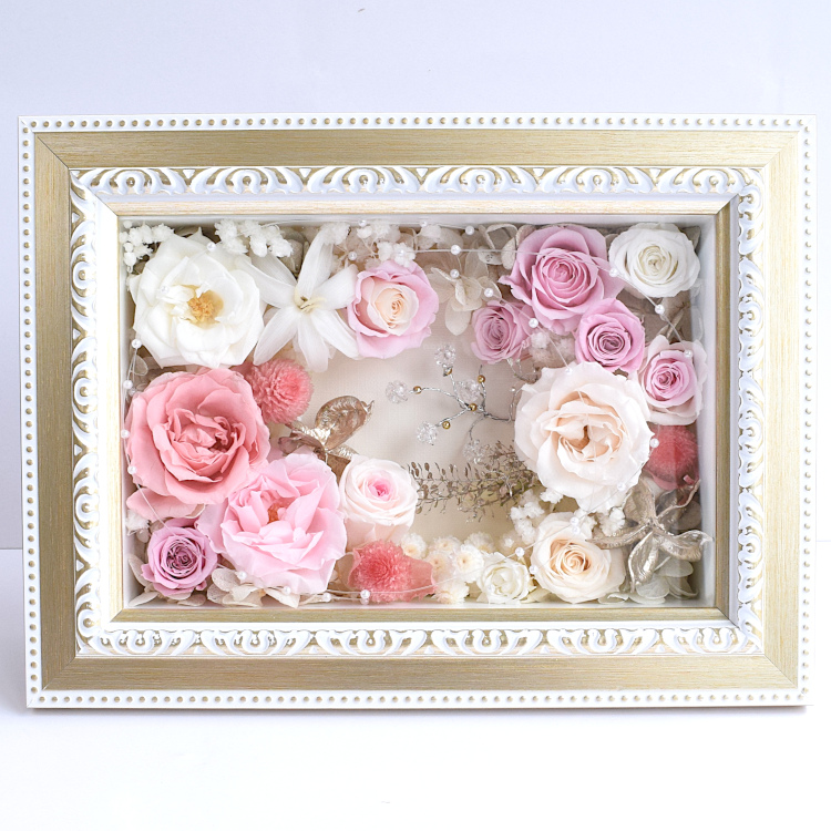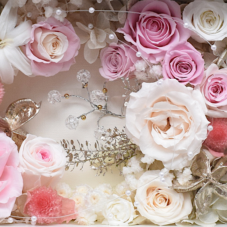 咲き誇るピンクのバラやプラチナゴールドのコントラストをお楽しみください。 |
