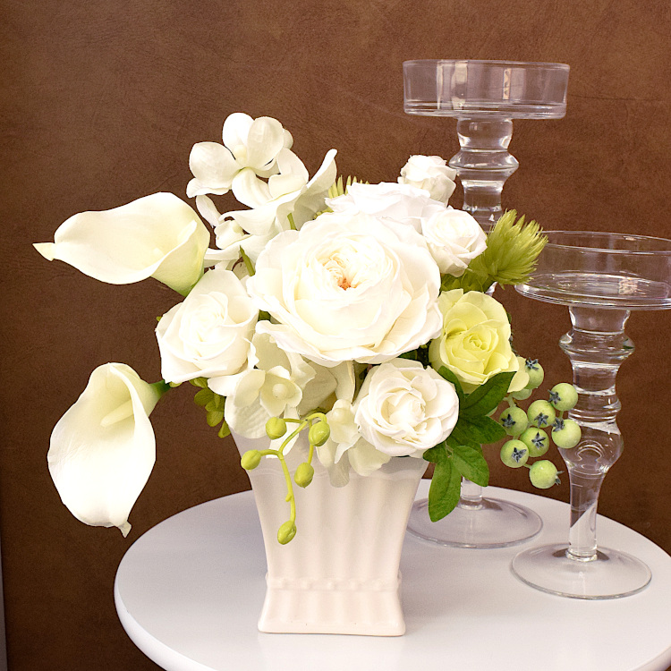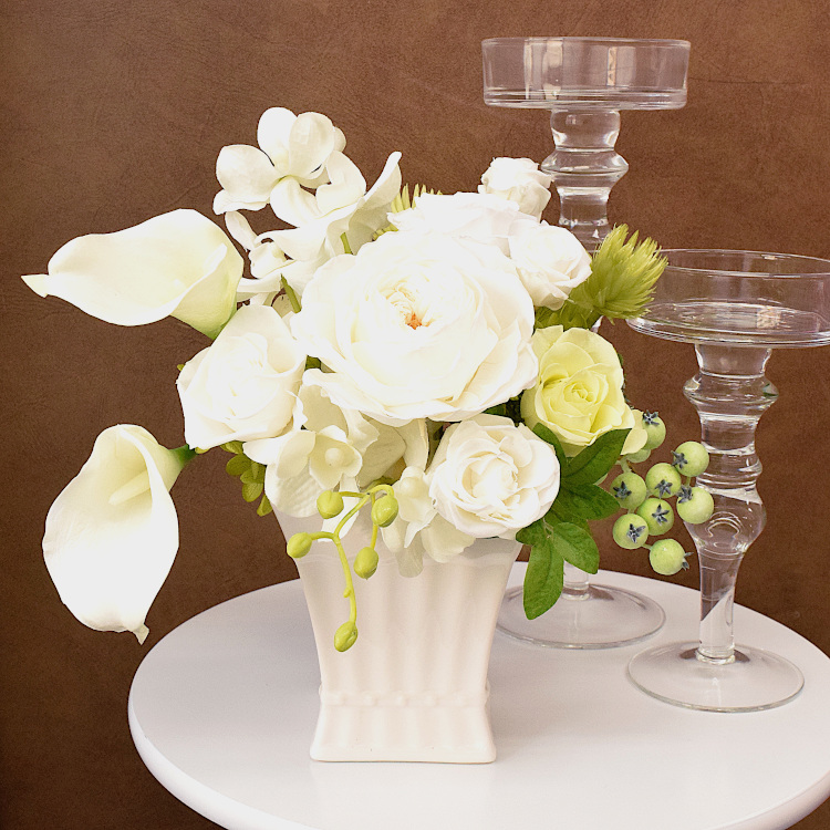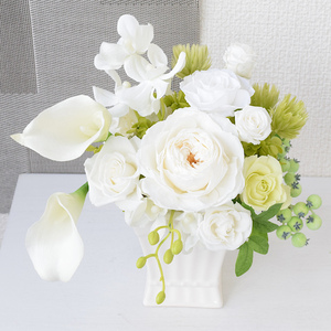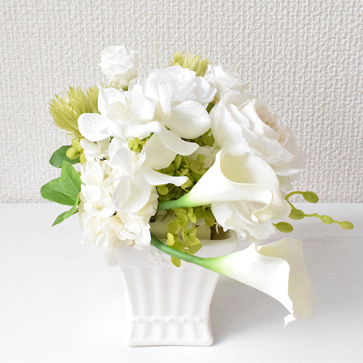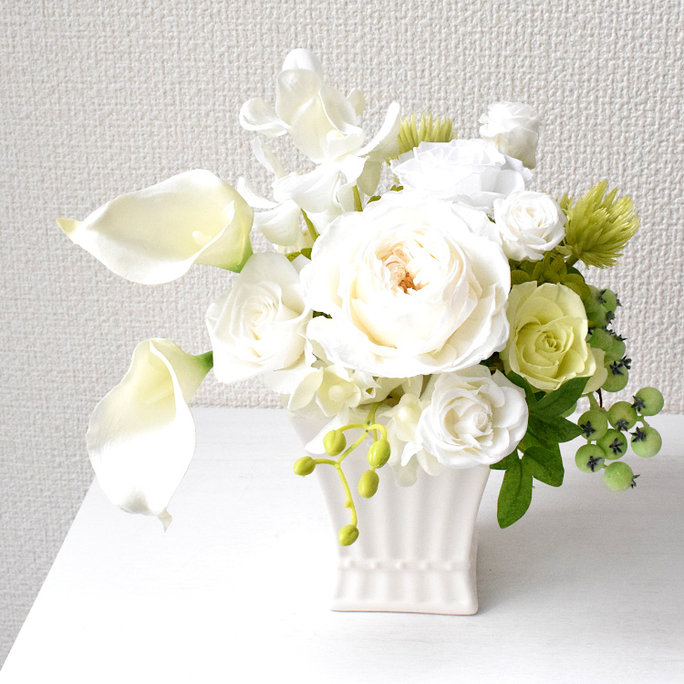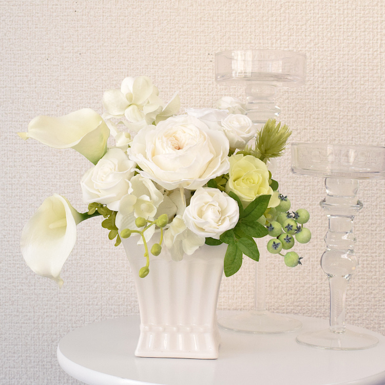 白くエレガントな陶器入りのアレンジです。