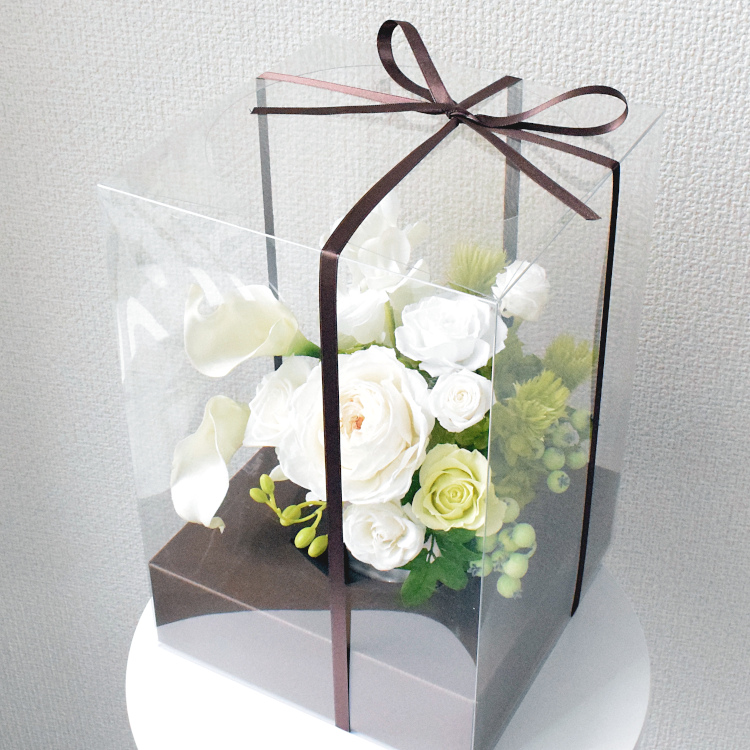 プリザーブドフラワーは白いてまり咲きのものをメインにゆったりとした柔らかな印象のアレンジに仕上げました。